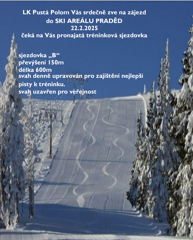 LK Pustá Polom vás srdečně zve na zájezd do Ski Areálu Praděd, který se koná 22. února 2025. Účastníky čeká pronajatá tréninková sjezdovka B s převýšením 150 metrů a délkou 600 metrů. V ceně zájezdu je zahrnuta doprava, celodenní lyžování od 9:00 do 16:00 na volné sjezdovce a poplatek za výjezd na Ovčárnu. Zájezd je vhodný i pro běžkaře a pěší turisty. Odjezd ze zastávky Pustá Polom je v 5:45. Pro ty, kteří se chtějí dopravit vlastním vozem, je možnost připojení na Hvězdě, avšak je nutná předchozí domluva.